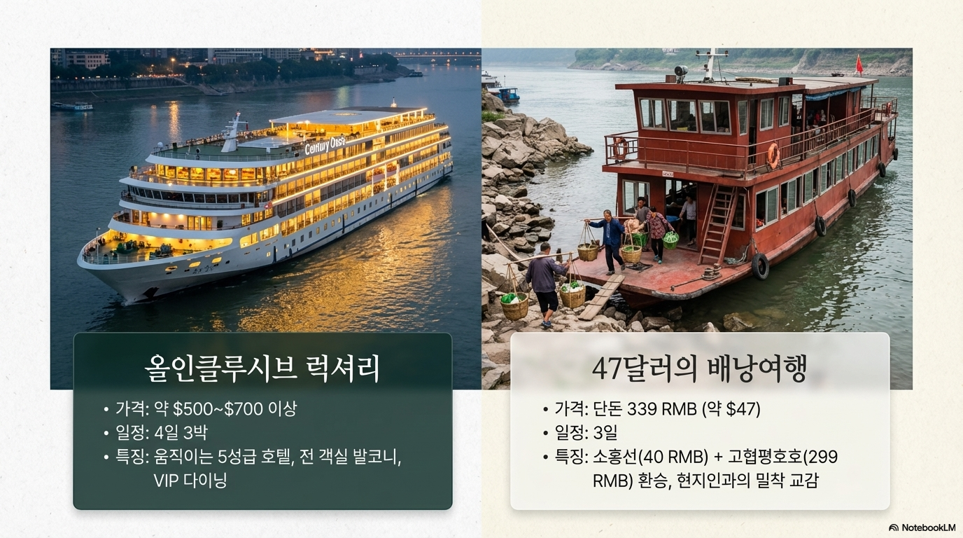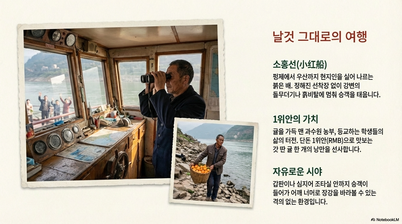 중국의 지리적·문화적 상징인 장강 삼협(長江 三峽)을 탐구하는 방법은 경제적 선택에 따라 극명하게 나뉩니다. 누군가는 3,0005,000달러(약 400만600만 원)에 달하는 초호화 크루즈에 올라 멀리서 풍경을 관조하지만, 현지 주민들의 진짜 삶 속으로 들어가려는 이들은 **30위안(약 5,500원)**을 내고 선체가 붉게 칠해진 현지인들의 공공버스, **'소홍선(小紅船)'**에 오릅니다.