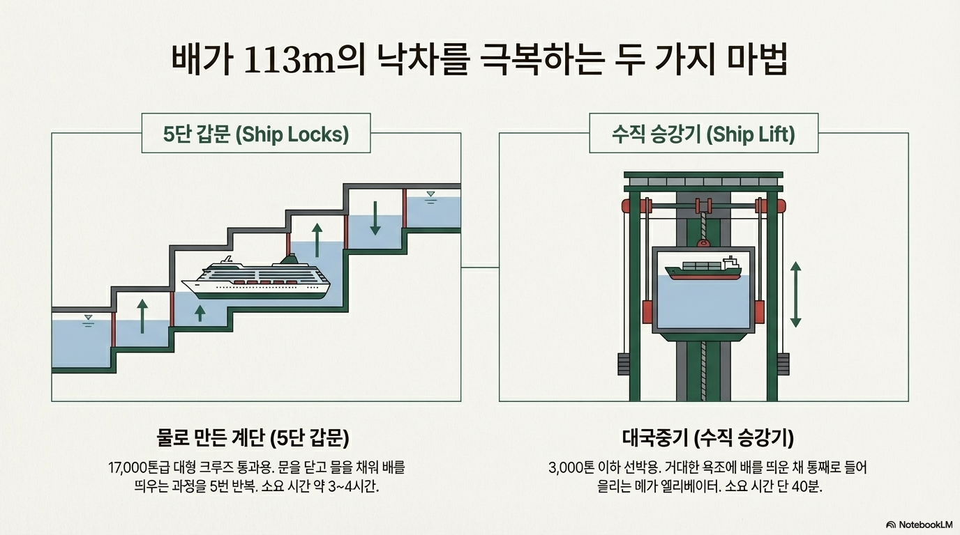 양쯔강 여정의 기술적 정점은 단연 **산샤 댐(Three Gorges Dam)**입니다. 높이 185m에 달하는 이 거대한 콘크리트 장벽은 현대 중국의 지정학적 야망을 상징합니다. 여기서 우리는 인류가 물을 다스리기 위해 고안한 두 가지 극명한 혁신을 목격하게 됩니다.