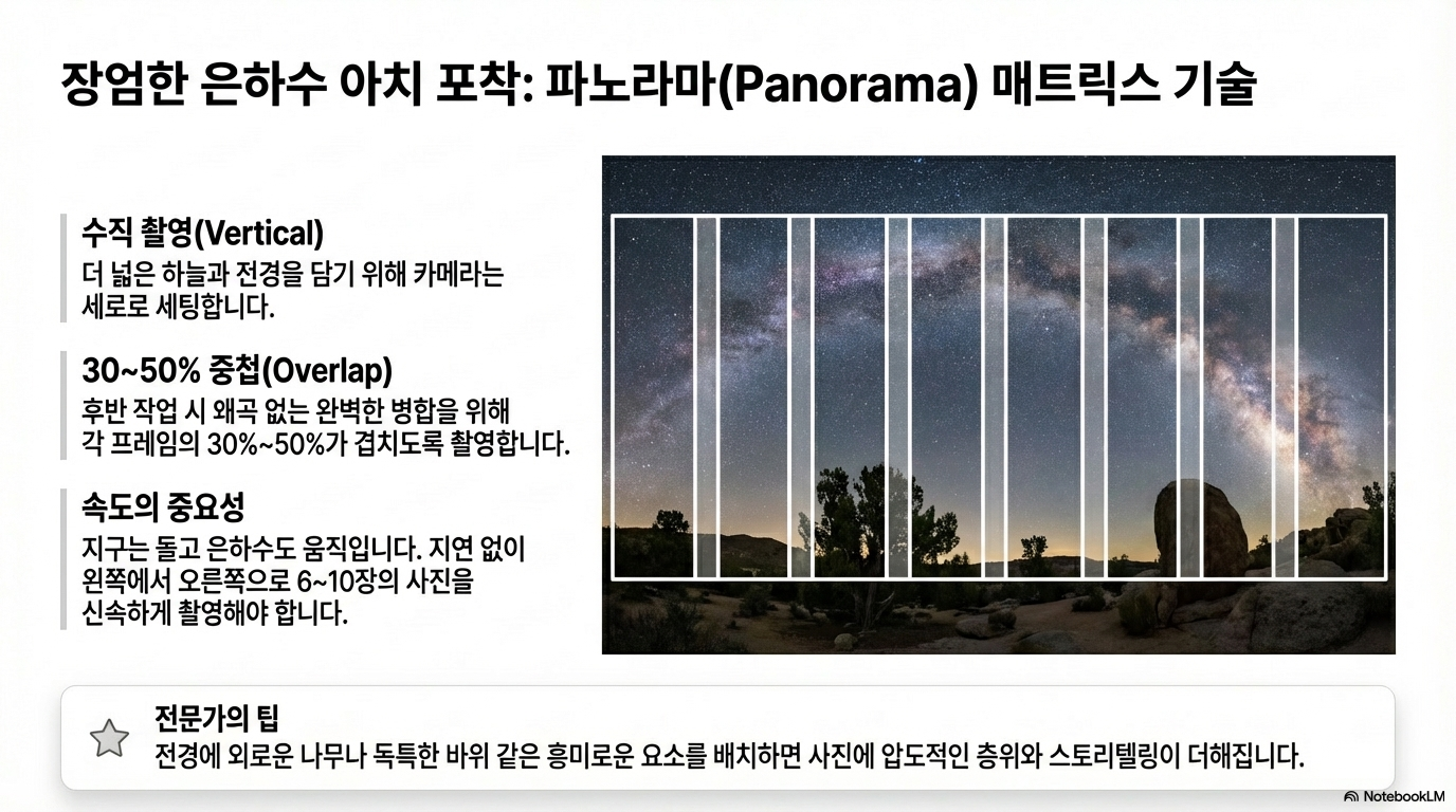 초점은 라이브 뷰 100% 확대 후 밝은 별에 수동으로 맞춤. 전경 요소(나무, 바위) 활용. 매트릭스 촬영 시 30~50% 중첩 필요.