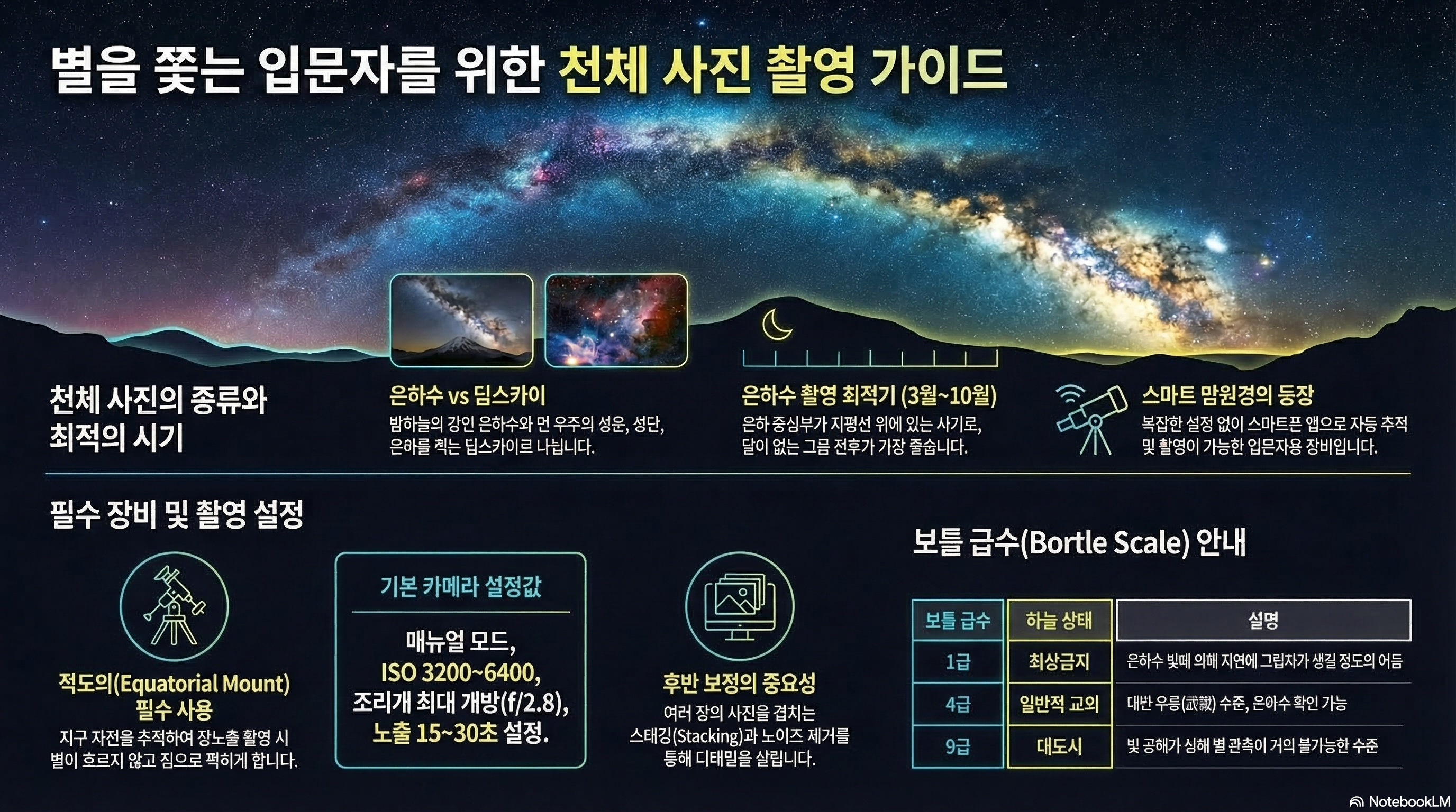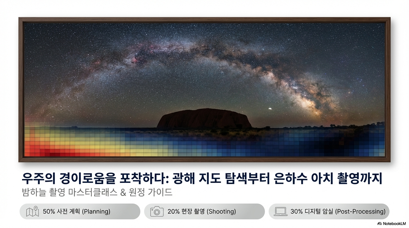 본 가이드는 제공된 소스 컨텍스트를 바탕으로 은하수 및 심우주(Deep Sky) 천체 사진 촬영의 이론, 장비, 기법 및 후보정 과정을 체계적으로 학습하기 위해 제작되었습니다.
