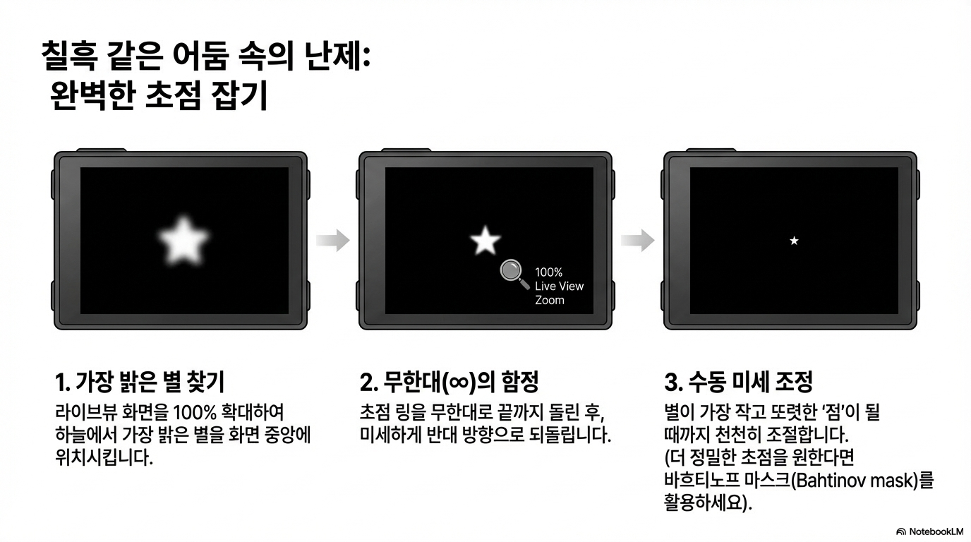 - 초점: 라이브 뷰를 100% 확대하여 가장 밝은 별을 기준으로 수동 조절합니다.