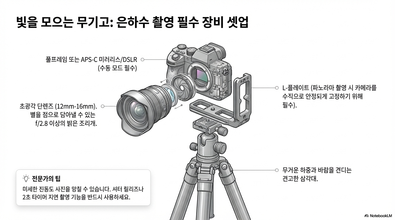 풀프레임 카메라, 광각 렌즈(14mm16mm 권장), 삼각대, 파노라마 헤드, ISO 32006400, f/2.8 이상, 노출 15~30초(400 법칙 준수).
