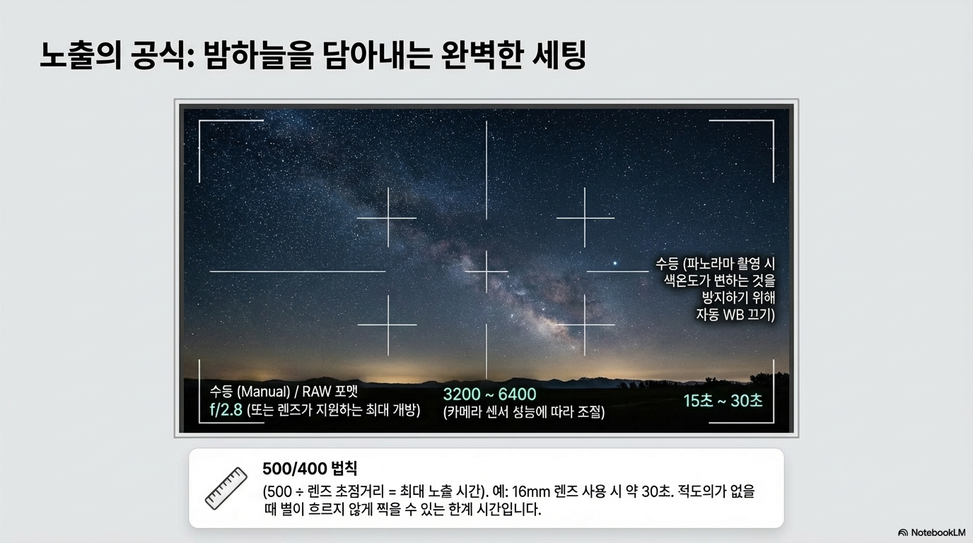 - 노출 시간: **'400 법칙'**을 따르세요. (400 / 렌즈 초점거리 = 최대 노출 시간) 예를 들어 16mm 렌즈라면 25초 이내가 적당합니다. 별이 선으로 흐르는 것을 방지해 줍니다.