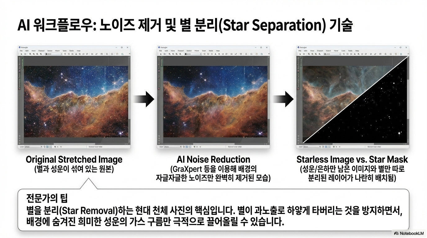 그래서 사진가들은 PixInsight나 Photoshop 같은 도구를 필수로 사용합니다. 밀라바와 제임스가 강조하는 기술 중 하나는 **'디컨볼루션(Deconvolution)'**입니다. 이는 단순히 별을 작게 만드는 것이 아니라, 대기로 인해 흐려진 우주의 데이터를 수학적 계산을 통해 역으로 되돌려 선명하게 만드는 과정입니다. 여기에 GraXpert를 이용한 노이즈 제거와 CosmoClarity를 이용한 정교한 별 크기 축소가 더해지면 비로소 우리가 아는 경이로운 우주 사진이 탄생합니다.