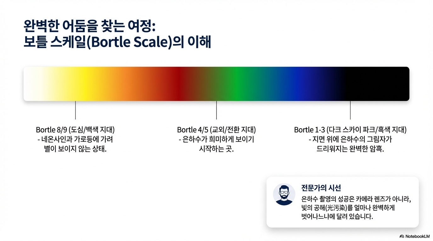 - 보틀 등급 (Bortle Scale): 밤하늘의 어둡기(빛 공해 정도)를 측정하는 1~9단계 척도.