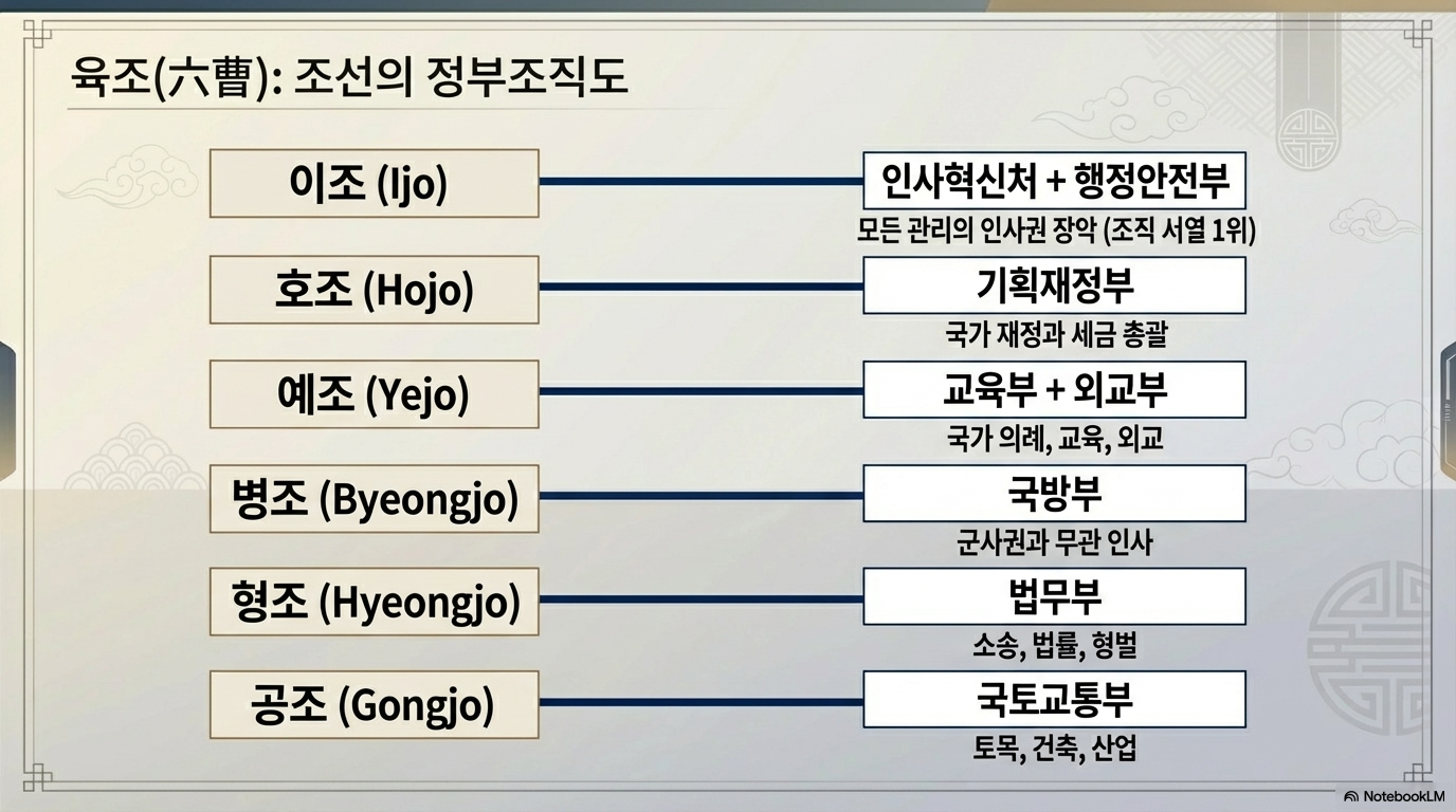 - 이조 (吏曹): 문관의 인사, 임명, 훈봉 등 인사 행정 (현 행정안전부/인사혁신처).