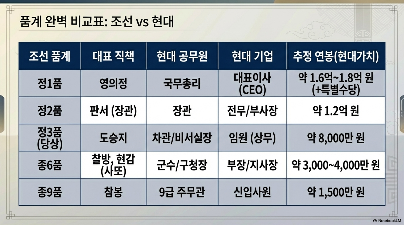 조선은 '품계(Rank) 중심'의 사회였던 반면, 현대는 '보직(Post) 중심'의 사회다. 조선에서는 보직이 없어도 품계 자체가 신분을 보장했지만, 현대는 실질적인 보직과 업무 수행이 권위의 근거가 된다.