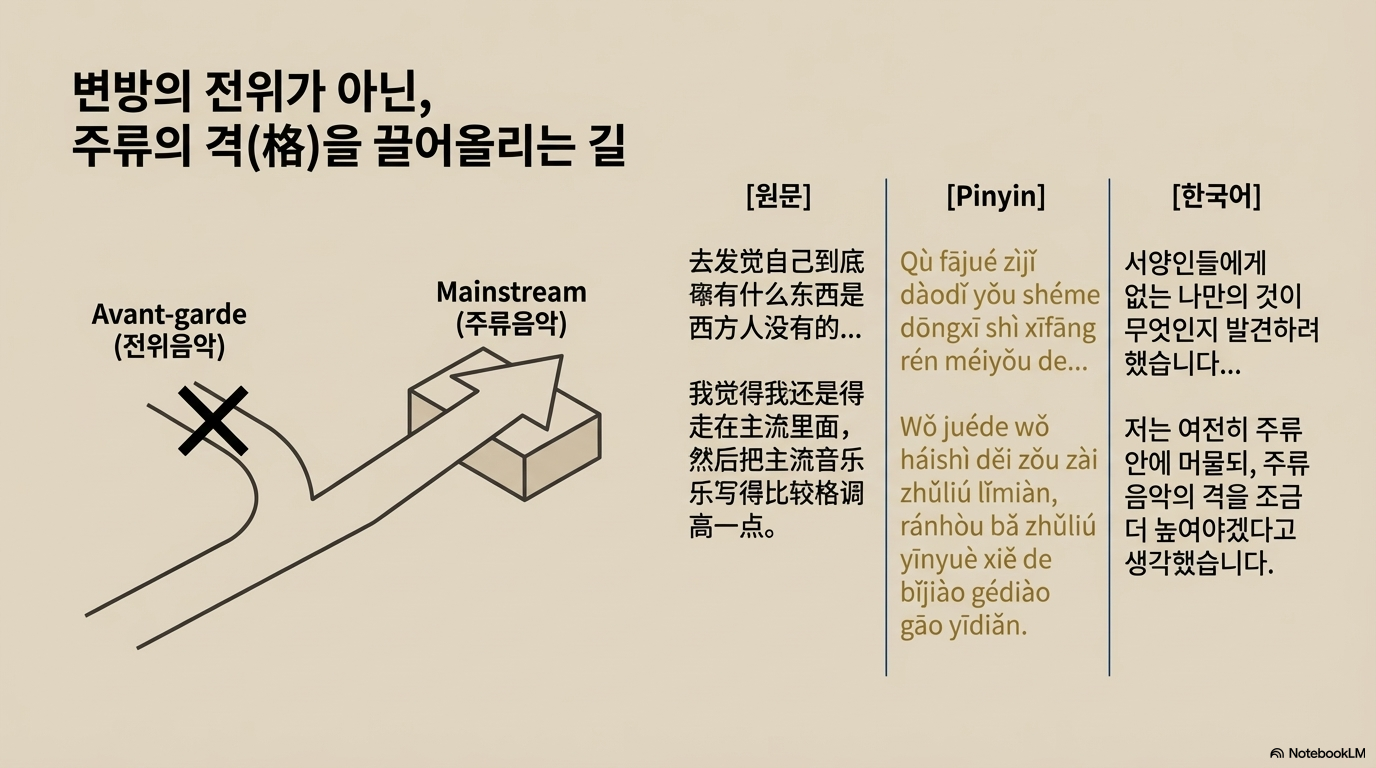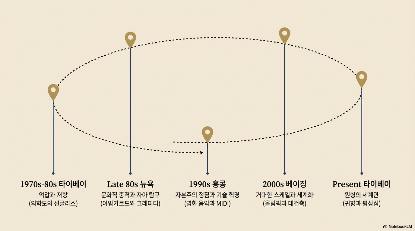 - 언어적 소외와 비언어적 소통 전략: 광둥어 중심의 홍콩 시장에서 '국어(Mandarin)인'으로서 느낀 소외감은 그를 영화 음악이라는 **'비언어적 매체'**로 이끌었다. 이는 언어적 헤게모니를 우회하여 시장 점유율을 확보하려는 영리한 전략적 피벗(Pivot)이었으며, 그의 음악을 시각적 서사와 결합시키는 성과를 냈다.