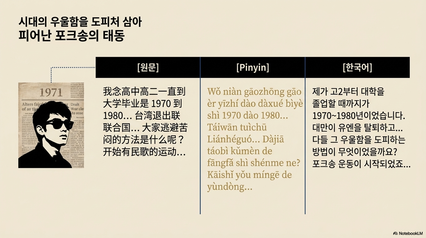 로다우가 청년기를 보낸 1970년대 대만은 국제적 고립과 정치적 격변이 몰아치던 '고독한 섬'이었습니다. UN 탈퇴와 일본과의 단교, 그리고 절대권력자 장제스의 사망은 청년들에게 거대한 정체성의 혼란을 안겨주었습니다. 이러한 억눌린 공기 속에서 탄생한 것이 바로 '우리만의 언어'로 노래하고자 했던 캠퍼스 포크, 즉 민가(民歌, Minga) 운동이었습니다.