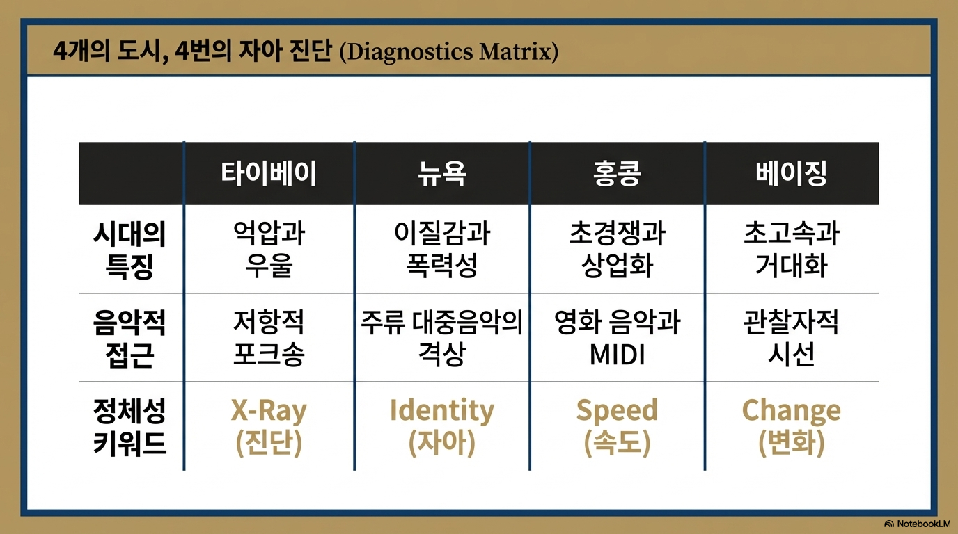 본 분석서는 대중음악가 로다우(羅大佑)의 경력을 단순한 연대기가 아닌, 타이베이, 뉴욕, 홍콩, 베이징으로 이어지는 거점의 변화와 그에 따른 창작 전략의 진화 과정으로 고찰한다. 문화 인류학적 관점에서 그의 지리적 이동은 각 시대의 사회적 병리(病理)를 진단하고 예술적 처방을 내리는 과정이었으며, 이는 궁극적으로 인간의 본질로 회귀하는 거대한 원형적 여정이다.