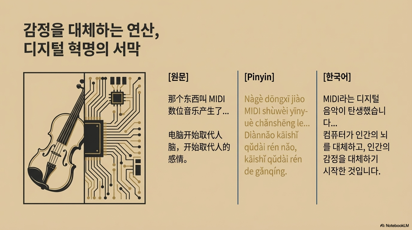 - 기술은 도구일 뿐, 핵심은 'Beef'다: AI와 MIDI가 음악을 대신해 줄지라도, 예술의 진짜 알맹이는 고통과 고독 속에서 길어 올린 인간의 경험임을 잊지 마십시오.
