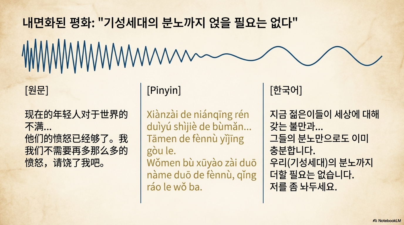 - 정서적 유연화와 시대적 숙명: 이제 노장은 분노를 강요하지 않는다. 젊은 세대의 불안과 분노를 그들의 몫으로 인정하며, 자신은 인간 본연의 평화와 따뜻함에 집중하는 <가(家)>의 정서를 노래한다. 이는 퇴보가 아닌, 모든 시공간을 거친 대가만이 도달할 수 있는 '경력의 완성'이다.