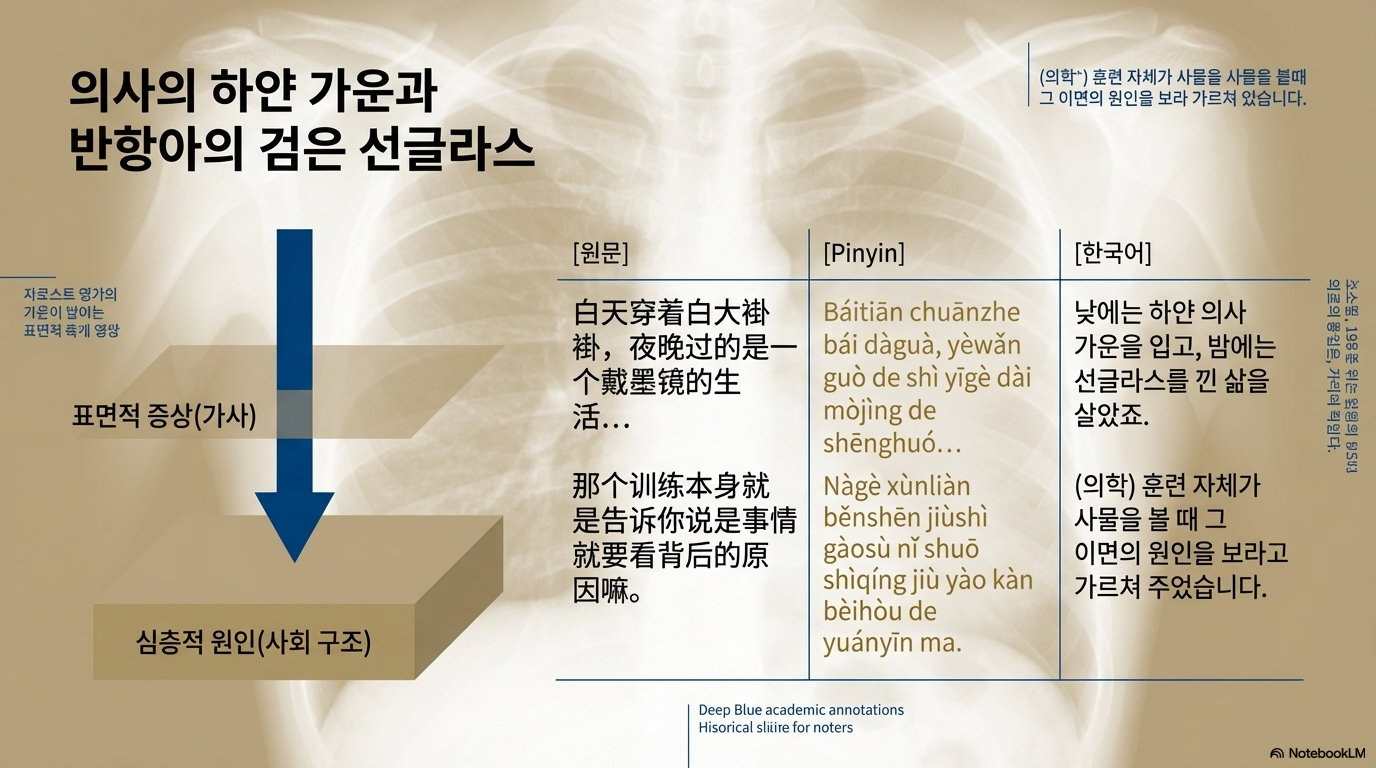 | 醫學訓練本身就是告訴你說事情就要看背後的原因嘛。 | Yīxué xùnliàn běnshēn jiùshì gàosù nǐ shuō shìqíng jiù yào kàn bèihòu de yuányīn ma. | 번역: 의학적 훈련은 사건의 이면에 숨겨진 근본적인 원인을 보라고 가르쳐 주었습니다. 해설: 로다우의 음악이 단순한 감상을 넘어 사회학적 분석의 성격을 띠게 된 뿌리가 의학적 사고방식에 있음을 밝힙니다. |