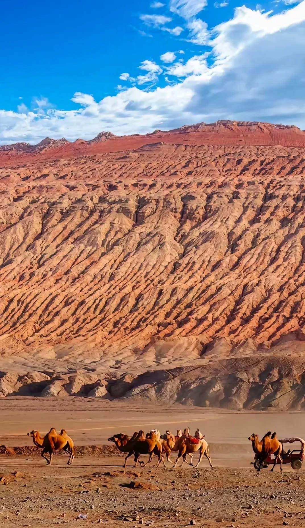 这里的山体色彩斑斓,赤红如火,在烈日的照耀下,仿佛整个山脉都在燃烧,因此得名“火焰山”。